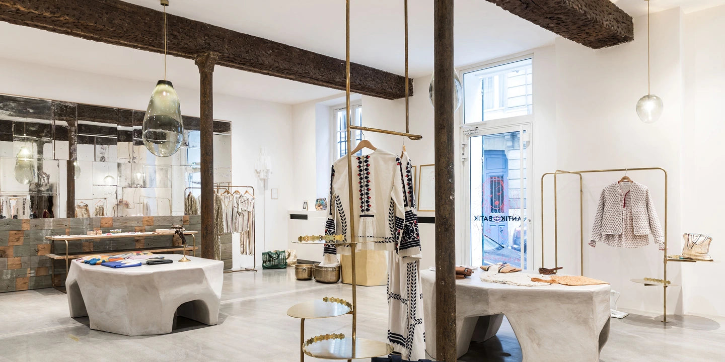 A secret jewel box hidden behind a discreet door. Delicate and charming, the Antik Batik Atelier invites you to settle in, choose, and dress yourself… in complete intimacy. Come discover all the pieces of the collection and place your orders on-site using the tablets available to you. For the most eager, a few exclusive pieces are available for purchase directly in-store. At the back of the Antik Batik Atelier, a cozy and welcoming boudoir reveals itself — a place to take the time to enjoy a tea, chat, or dream for five minutes, an hour… or even the whole day. Far beyond a simple ready-to-wear boutique, our ambition is to take you on a journey to India — a truly unique experience.