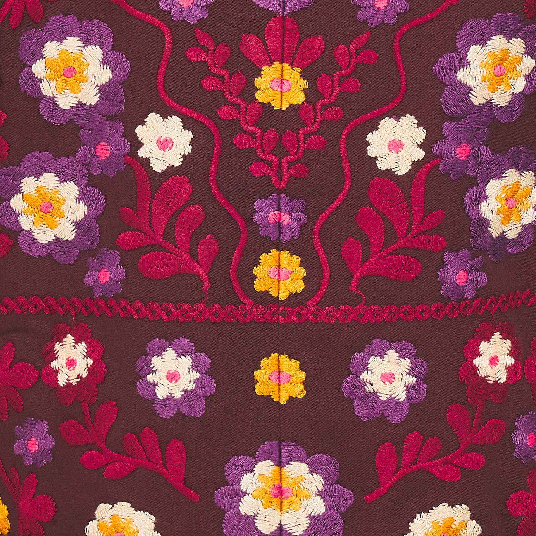 Afghan-inspired sleeveless embroidered jacket. Handcrafted floral embroidery throughout. Tonal lambskin trim. Ultra-soft faux fur lining. Hook-and-eye closure.