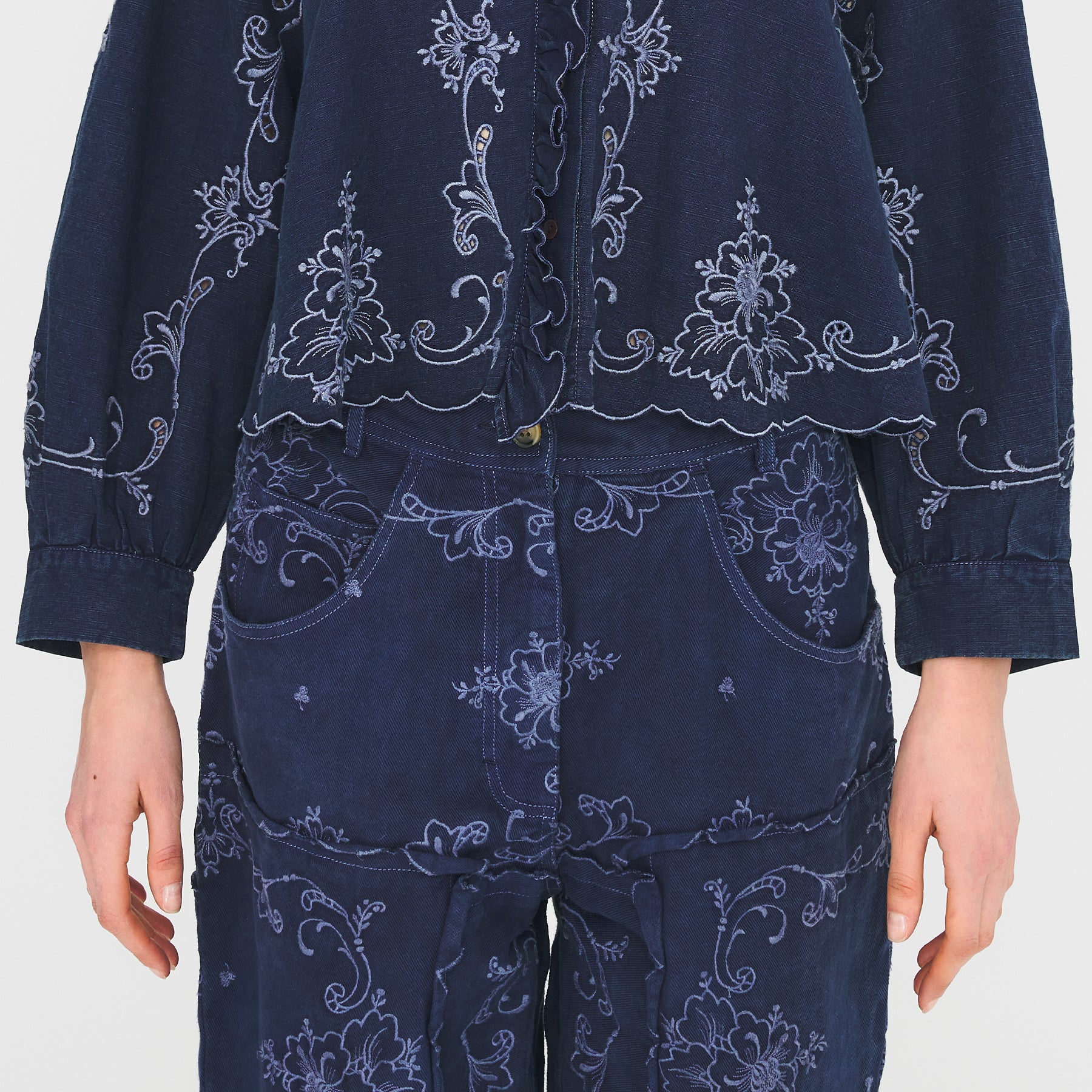 Cette pièce met à l’honneur une broderie ton sur ton réalisée sur des tissus découpés à la main, assemblés façon patchwork de napperons anciens. Les couleurs, travaillées artisanalement avec un effet délavé, évoquent la patine du temps et la richesse des teintures naturelles.