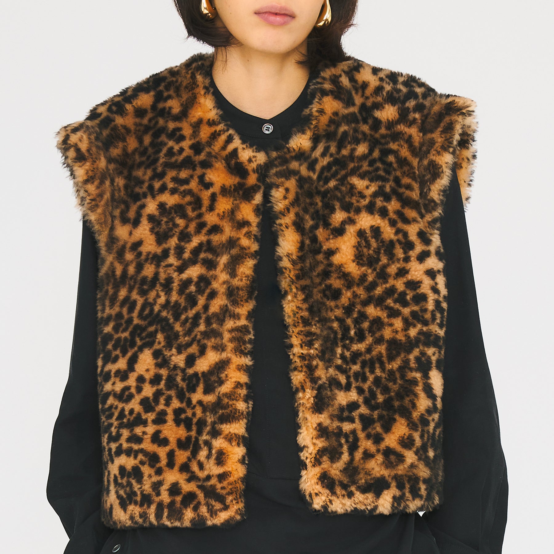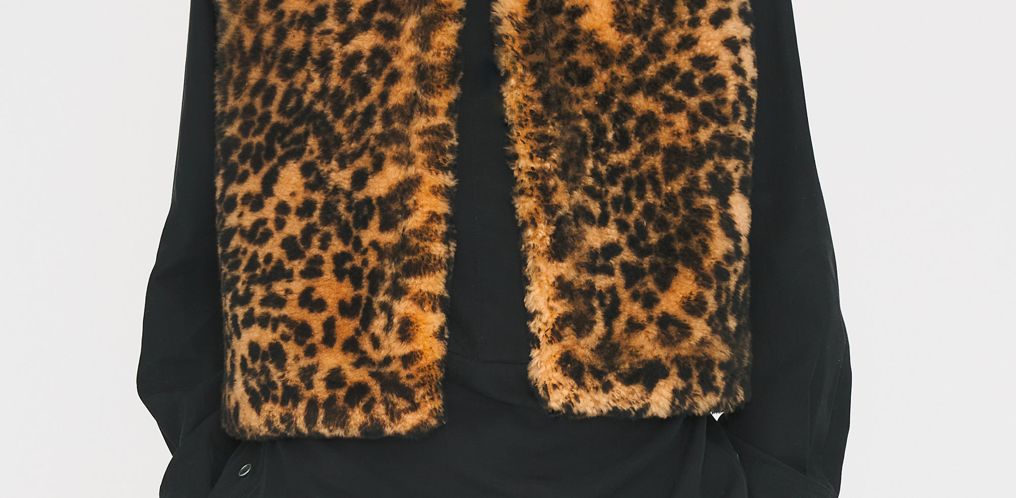 Ce gilet en mouton réversible révèle deux visages d’un même savoir-faire : un côté peau naturelle, sobre et texturé, et un côté à poil long, peint à la main d’un motif léopard. Ce travail artisanal transforme la fourrure en surface vivante, où la lumière accroche la couleur et souligne le mouvement du poil.