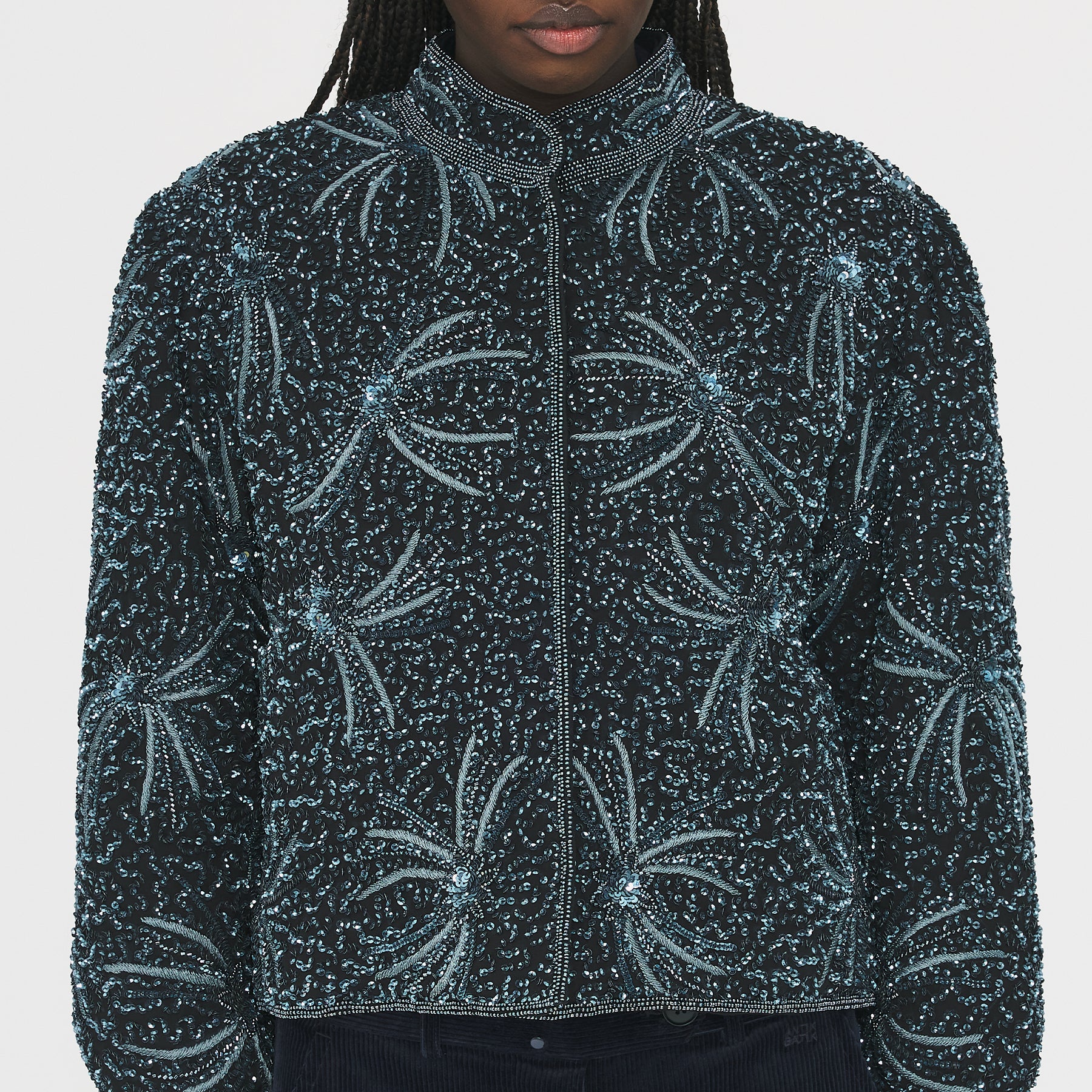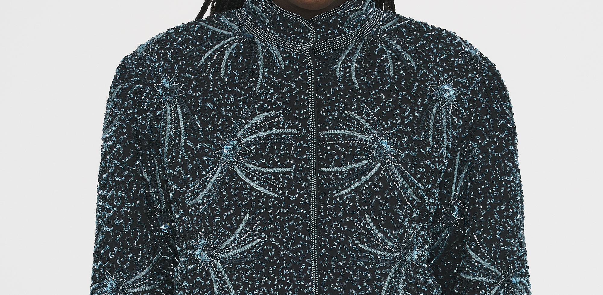 Chaque pièce est brodée à la main, au fil et à l’aiguille, sur un métier en bois traditionnel. Les sequins et cristaux y sont cousus un à un, dans une précision qui relève de la pièce semi-couture.